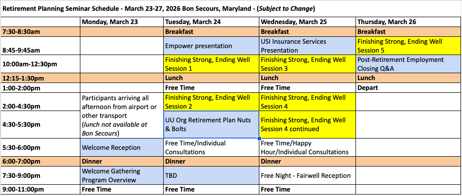 📣 We are excited to announce the 2026 Retirement Planning Seminar: An Interactive Retreat for UU Professionals including Ministers, Religious Educators, and Other Professionals Planning to Retire in the Next Ten Years.Â