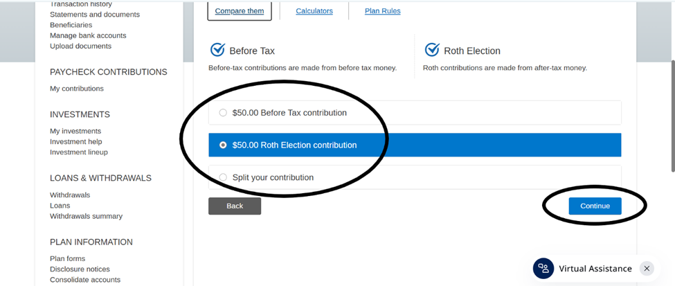 Split your contribution (between before tax and Roth). If you choose to split your contribution, it will ask you to enter how much toward each election.