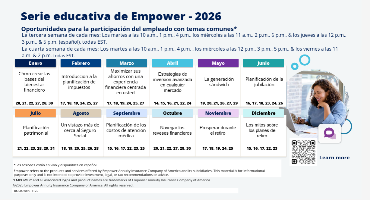 If you are looking for a webinar that is an overview of the retirement plan and your account, we recommend the November 2025 recording: Benefits of your plan / Los beneficios de su plan. This 15 minute introduction discusses retirement income sources, benefits of savings through the plan, investment choices, how to enroll, and financial tools offered.